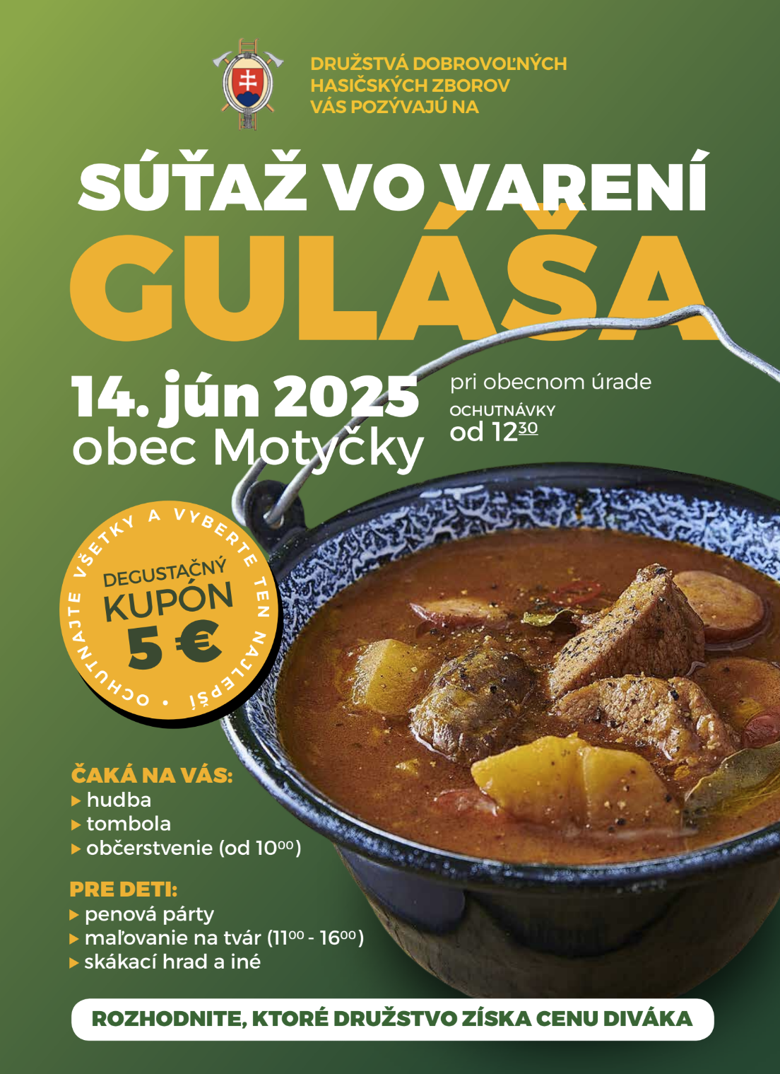DHZ Motyčky a Obec Motyčky pozýva všetkých priateľov na 0. ročník Súťaže vo varení gulášu DHZtiek,