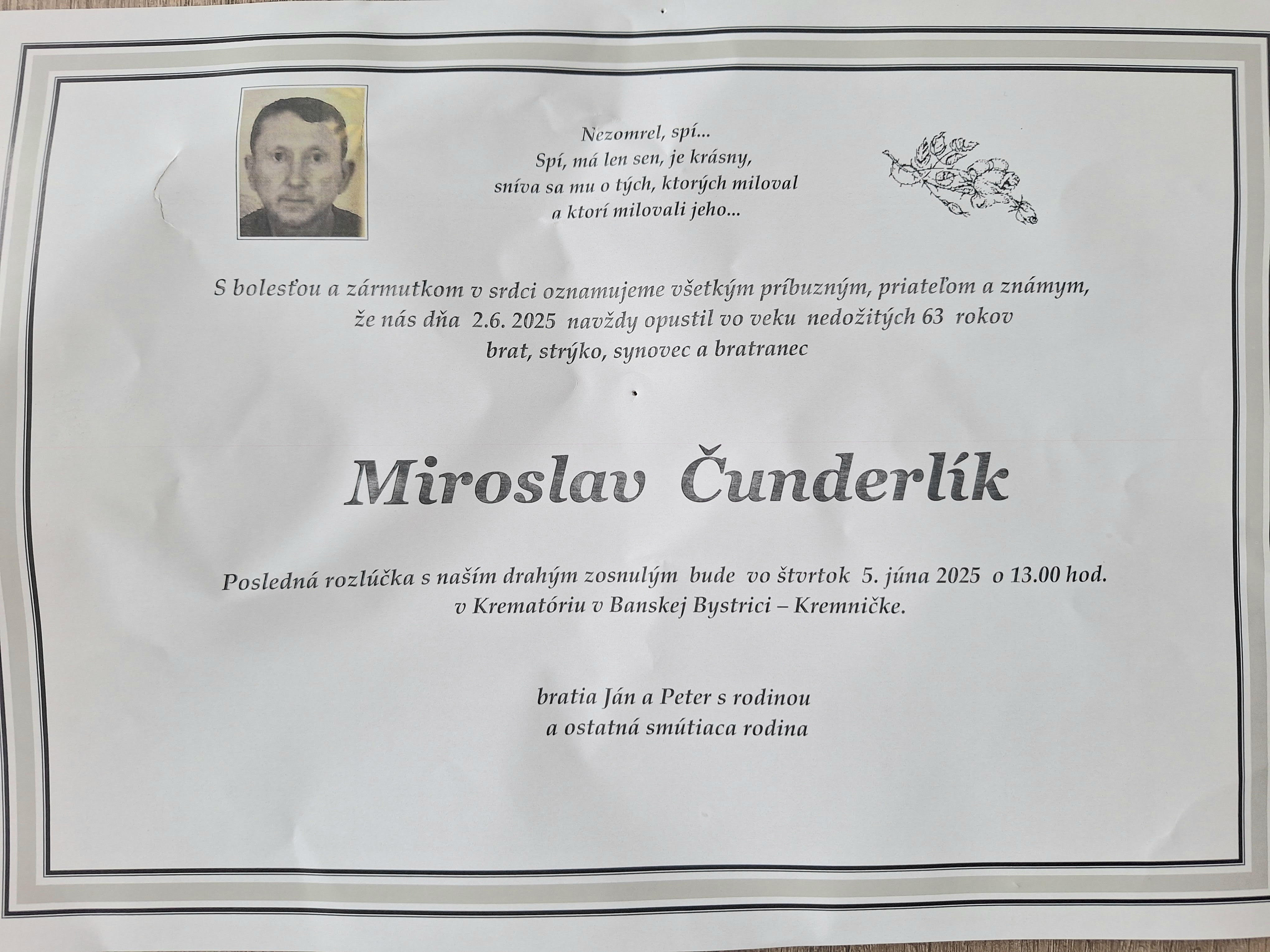 Miroslav Čunderlík, v mene obce a občanov sa mu chceme úprimne poďakovať za všetku pomoc, obetavosť a prácu, ktorú vykonal v prospech nás občanov obce.