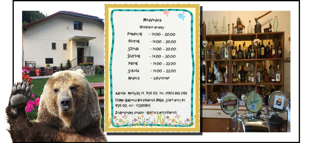 Na Motyčkách sa môžete občerstviť v bare Medvedica, ktorý sa nachádza z pravej strany obecného úradu.